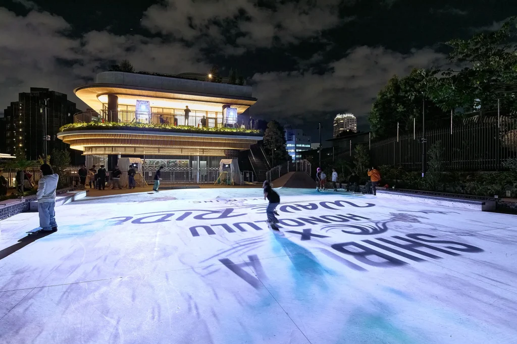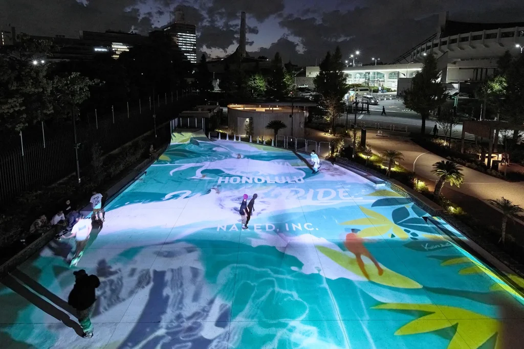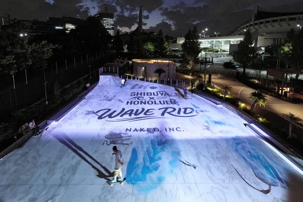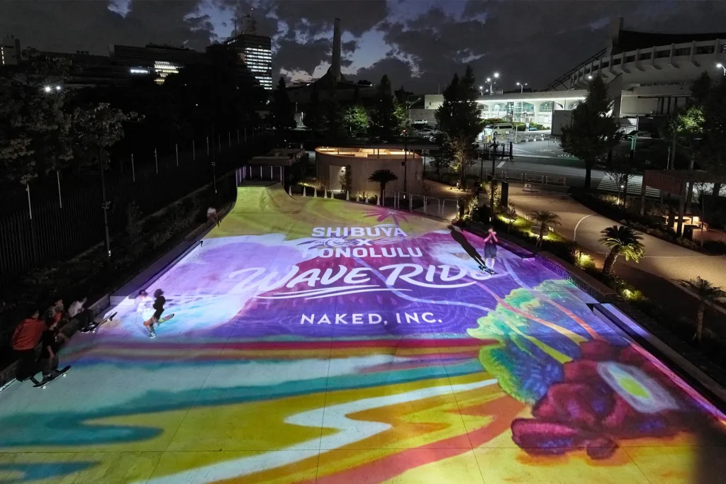 スケートボードが滑走すると、足元に波が広がり、ヤシの木や太陽、サーフボードが次々と現れる──。東京の新しいスケートボードの聖地・「代々木公園(BE STAGE)屋外アーバンスポーツパーク」を舞台に、渋谷とホノルルのボードカルチャーを繋ぐプロジェクションマッピングイベント『SHIBUYA×HONOLULU WAVE RIDE』が10月27日から11月3日の8日間に渡って開催され、ハワイのアーティストによるグラフィックと、スケーターの動きが融合したプロジェクションマッピング企画が行われました。 この企画を実施した「SHIBUYA×HONOLULU WAVE RIDE」の関係者に、プロジェクトの背景や制作の工夫、そして今後の展望について語ってもらいました。